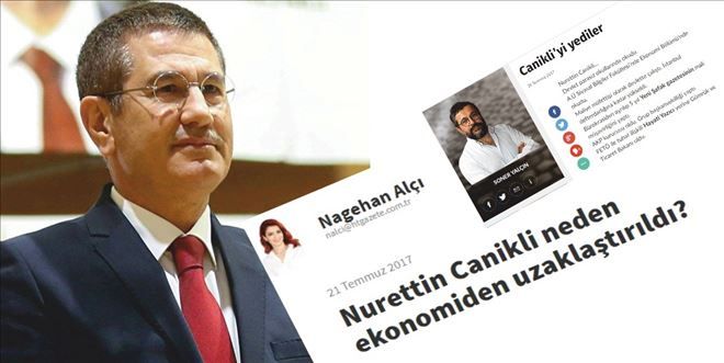 Haber Türk Gazetesi Yazarı Nagehan Alçı, 21 Temmuz 2017 tarihli ?Nurettin Canikli neden ekonomiden uzaklaştırıldı?´ başlıklı yazısında gündemi sarsan iddialarda bulundu.